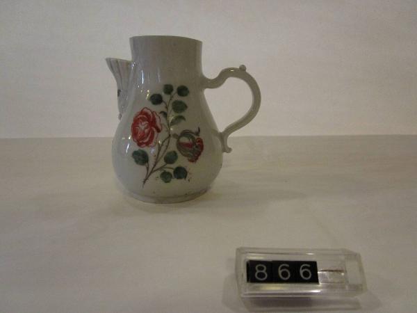 Caffettiera con beccuccio e manico ad ornati rilevati. Decorazione policroma con tralcio di rosa da un lato e dall'altro composizione di fiori gialli con al centro un ramoscello azzurro. Il coperchio è mancante. Questo modello è uno dei più caratteristici della manifattura veneziana, noto in più esemplari.