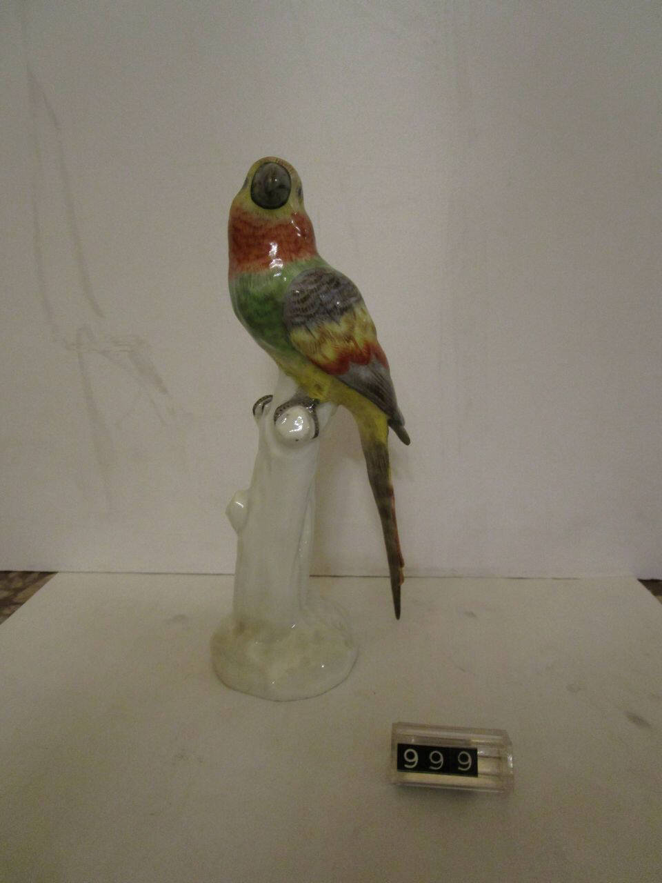 Figura di pappagallo a decorazione policroma, con lunga coda, appollaiato sopra un tronco d'albero bianco.