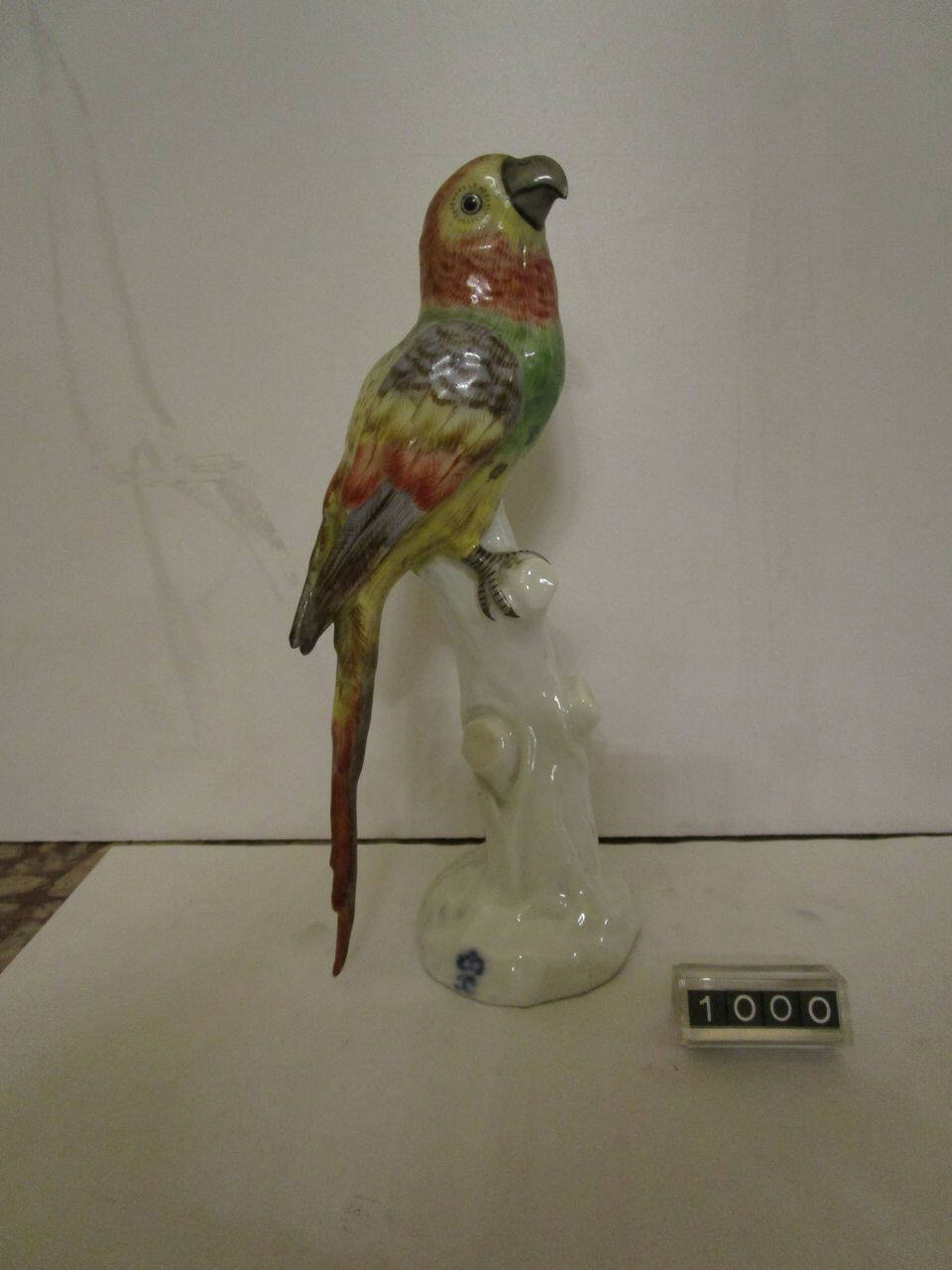 Figura di pappagallo a decorazione policroma, con lunga coda, appollaiato sopra un tronco d'albero bianco.