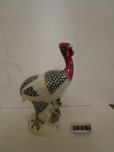 Figura di faraona con piume maculate nere, testa e collo rossi, appoggiata sul tronco di un albero dal quale spuntano foglie e fiori. Foglioline rotte.