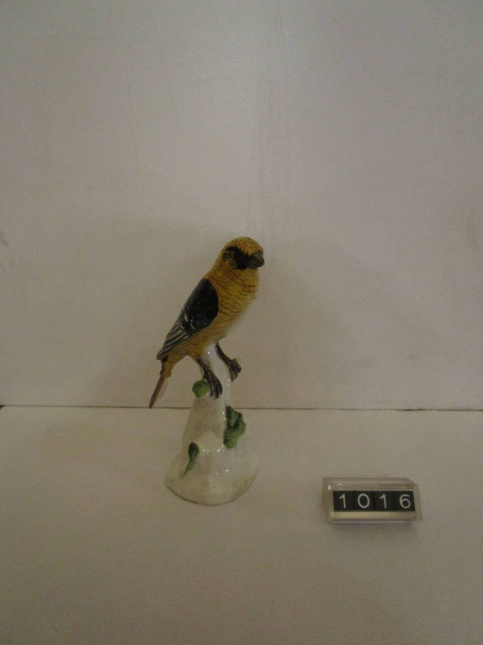 Figura di uccellino giallo appollaiato su tronco d'albero con foglie. Decorazione policroma. La Figura deriva da un modello originale di K?ndler del 1735 circa.