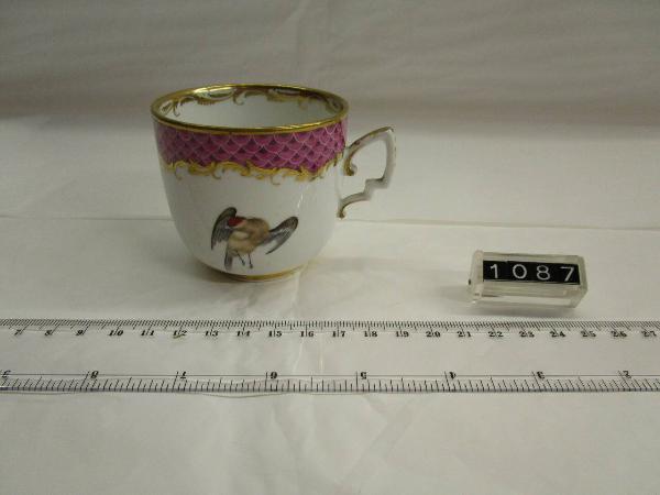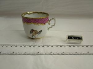 Tazzina a decorazione policroma con uccello e mazzo di fiori. Bordo a squame rosa con fregio a palmette in oro. Orlo interno ad ornati d'oro; manico angolato.