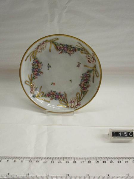 Piattino a decorazione policroma e oro con ghirlanda di fiori e nastri trattenuti da amorini su di un bassorilievo istoriato.