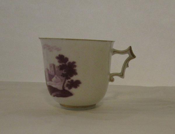 Tazzina con manico a decorazione monocroma rosso-violacea con paesaggio di alberi e case.