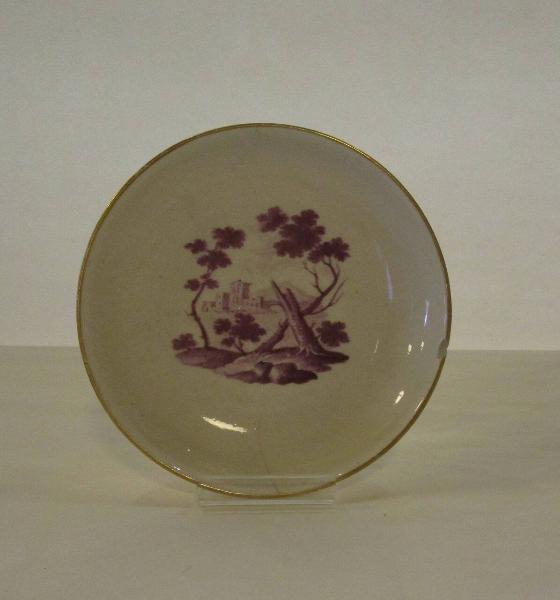 Tazzina con manico a decorazione monocroma rosso-violacea con paesaggio di alberi e case.