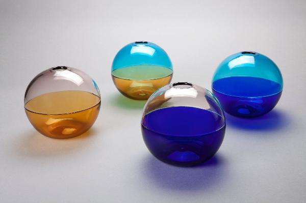 Composizione costituita da quattro sfere di uguale diametro di vetro soffiato con un'apertura circolare nella parte sommitale. Ogni sfera è formata da due metà (in senso orizzontale) di colore diverso: a) fumè/giallo; b) azzurro/giallo; c) incolore/blu; d) azzurro/blu.