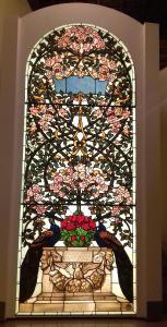 Vetrata a tre pannelli decorata con due pavoni affrontati su un pozzo dove è appoggiato un vaso da cui parte un'inflorescenza di rose.