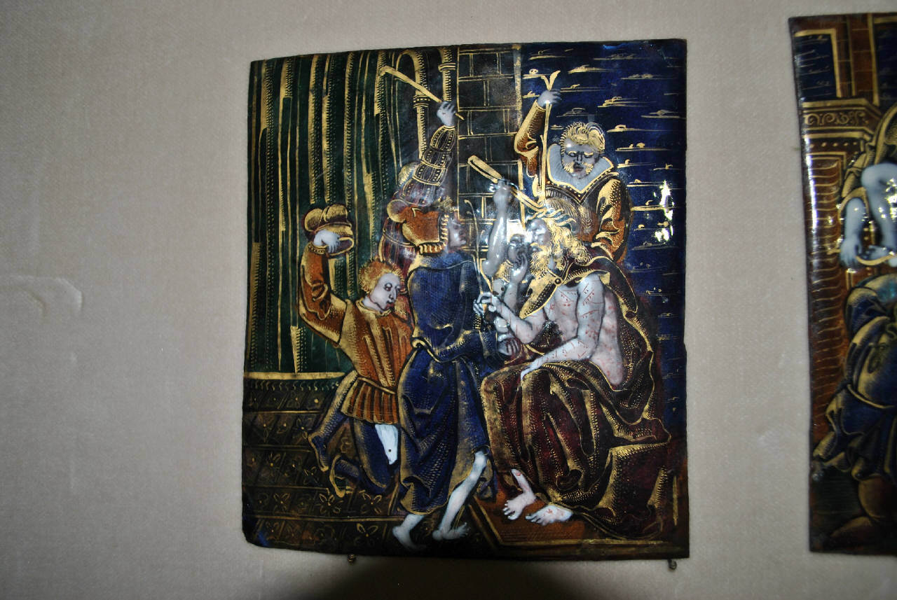- NOTIZIE STORICO CRITICHE La placchetta in esame fa parte di una serie di dodici placchette con scene della Passione di Cristo. L'autore limosino si è ispirato alle xilografie della Passione di Albrecht Durer pbblicate tra il 1497 e il 1511. Sulla didascalia dell'opera è proposta, in modo dubitativo, l'attribuzione al Maestro del polittico di Mesnil-sous-Jumièges.