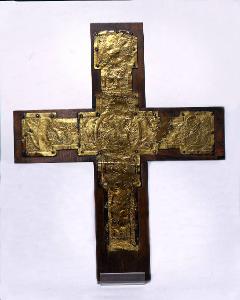 Parte posteriore di croce processionale, con il Pantocrator e i simboli dei quattro evangelisti, montata su supporto ligneo.