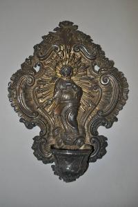 Acquasantiera in argento al centro della quale è sbalzata a forte rilievo la figura della Madonna Immacolata nell'atto di calpestare il demonio sottoforma di serpente. La figura è circondata da una cornice decorata da volute cocleari ed elementi fitomorfi.