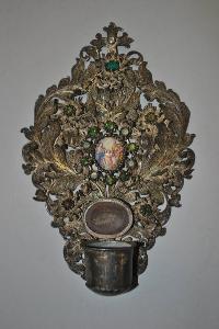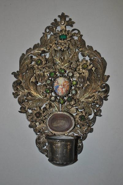 Acquasantiera pensile in argento, con vaschetta avente coperchio in agata, decorazioni incise e a smalto.