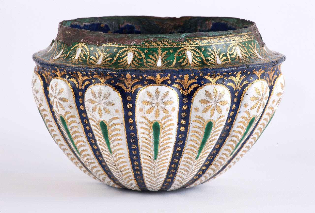 Coppetta semisferica ornata con baccellature bianche su fondo blu. Ogni caccellatura è separata dall'altra da un motivo a palma stilizzato dorato. Decorazioni a fiori dorati anche in ogni baccello. All'imboccatura decoratine a palmette oro su fondo verde.