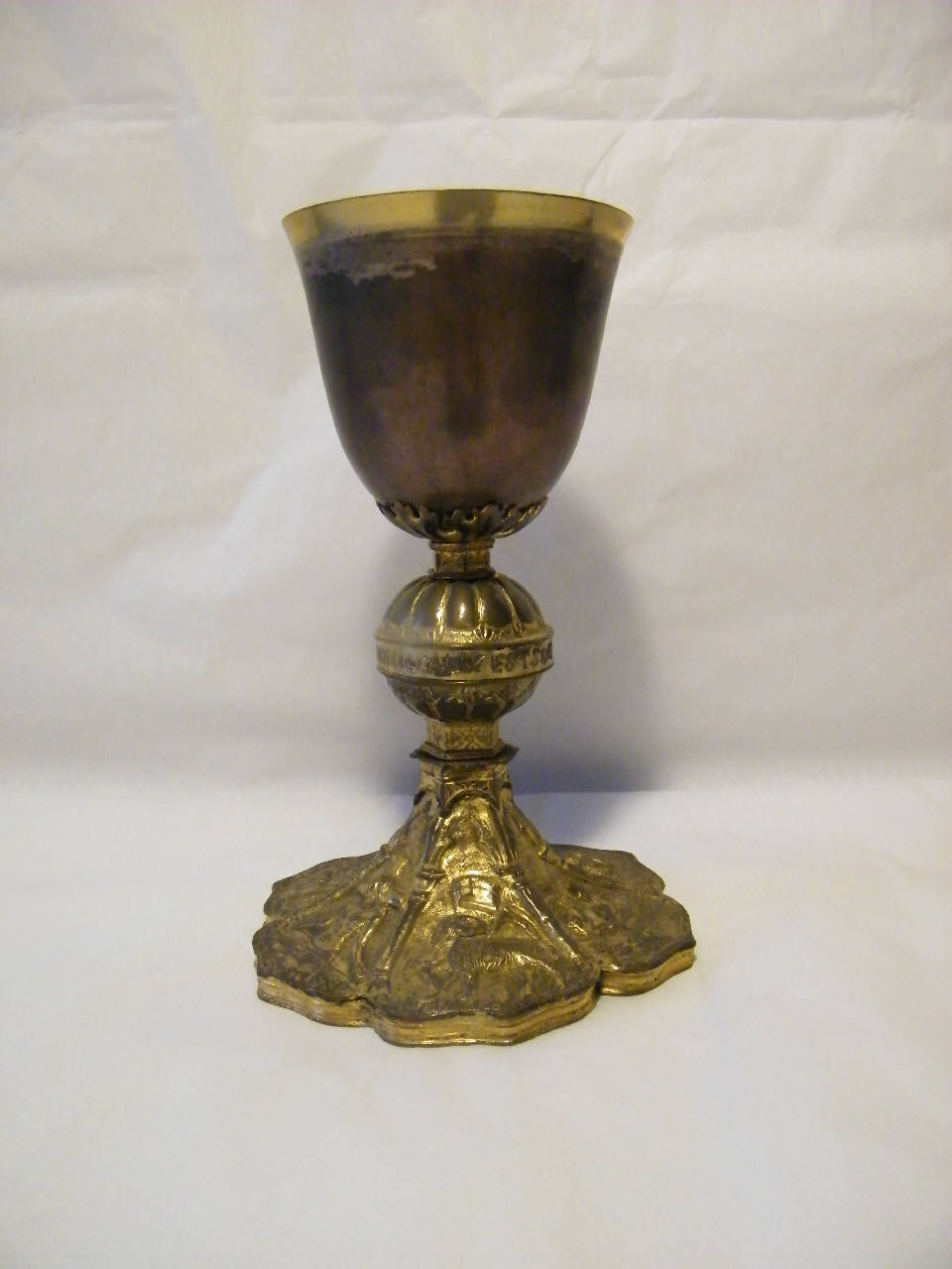 Calice in rame dorato, con piede polilobato a decorazioni sbalzate (Cristo nell'avello, l'agnello mistico ed altre iconografie).