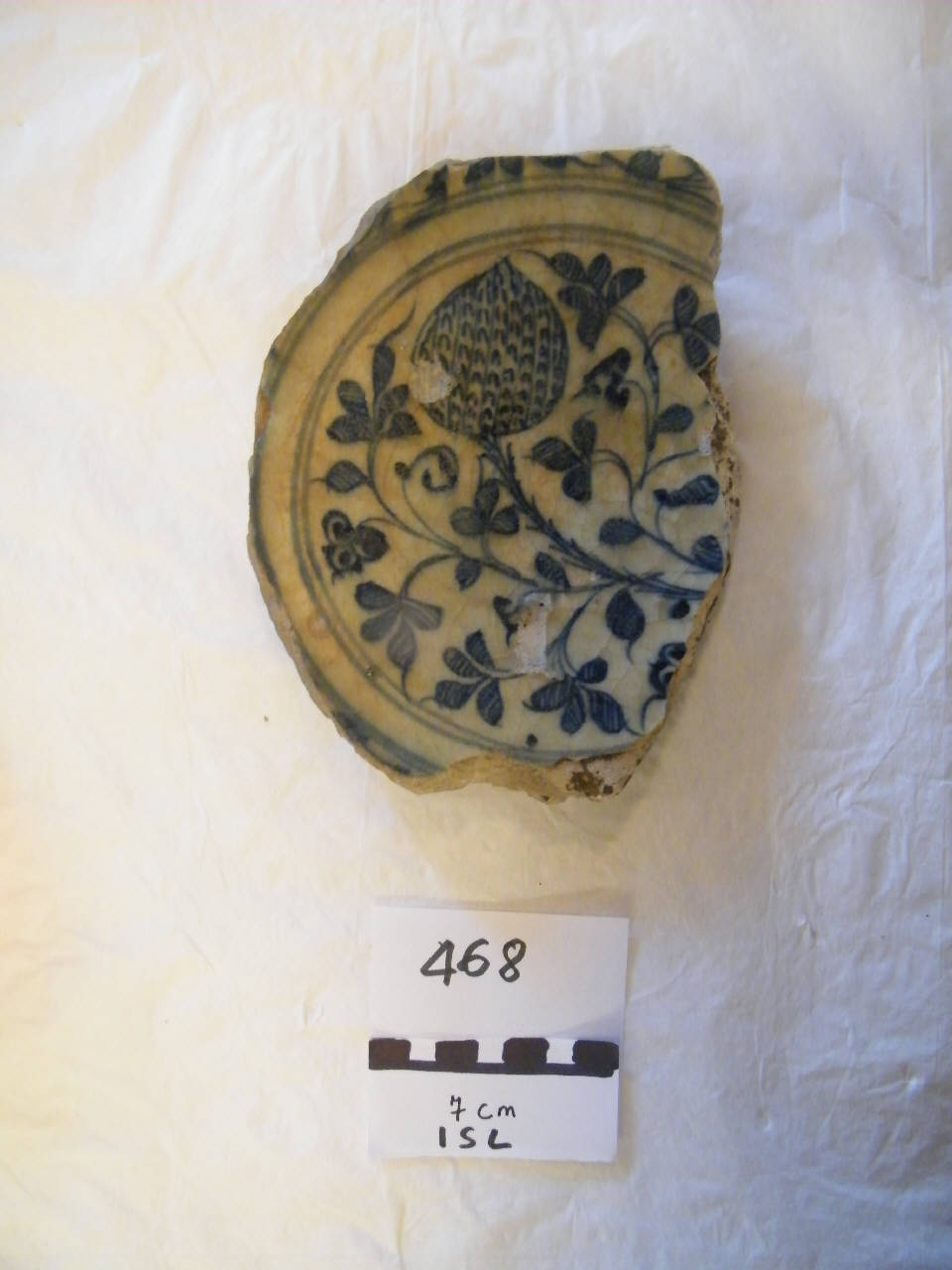 Frammento di recipiente (fondo) in ceramica dipinta in nero e blu su fondo bianco con vetrina trasparente. La decorazione è costituita da motivi geofitomorfi . L'impasto è bianco