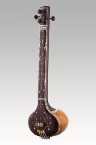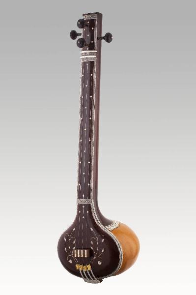 Tanpura indiano da bordone con cassa armonica formata da zucca tagliata longitudinalmente oltre la metà; manico e tavola armonica in legno con intarsi in avorio a forma di petali e fiori; bordo decorato da greche in osso intagliate; cavigliere con quattro piroli (due frontali e due laterali); le corde, all'estremità distale, prima di passare sopra il ponte, attraversano un dispositivo sagomato a forma di cigno in plastica, usato come appoggio della mano, per ottener il glissato; sul manico, intarsiati, diciannove quadrifogli (singoli alternati a coppie); ponticello piatto di legno con inserti di osso in corrispondenza delle corde, la cui superficie è leggermente incurvata per favorire il contatto con la corda vibrante. Tavola armonica con quattro quadrifogli, fiori e boccioli; il manico presenta sul retro una greca in corrispondenza del punto di contatto con la cassa.