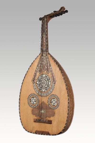 Ud (liuto arabo a pizzico) a manico corto con cassa armonica piriforme formata da quindici doghe con sette intarsi a forma di cuneo in legno più scuro e osso, cerchietti in avorio sotto e sopra; sotto il manico decoro simile; ogni doga è delimitata da intarsio a quadratini neri e bianchi; estremità del cavigliere decorata con l'applicazione di una piastrina quadrata osso e rosa geometrica; cavigliere incurvato all'indietro con undici piroli (manca il primo); capotasto con dieci tacche; ponticello con dodici fori; al di sopra del ponticello battipenna a profilo curvilineo; tavola armonica con tre fori di risonanza, ciascuno recante una rosa intagliata nella plastica; i fori sono contornati da greca con motivi geometrici; profilo bicolore lungo tutto il perimetro della tavola e del manico. La parte superiore della tavola è intarsiata con bande disposte simmetricamente.