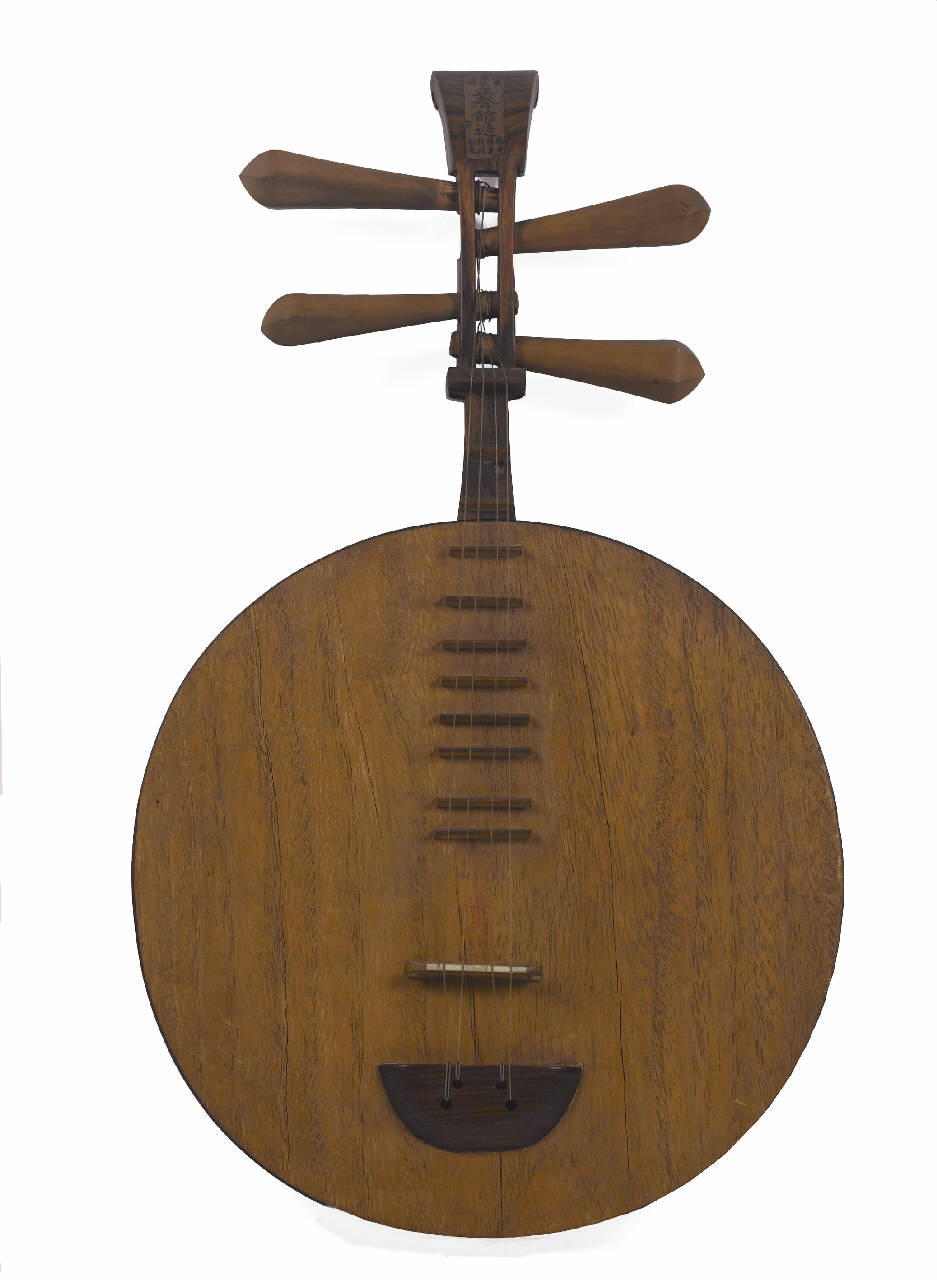 - NOTIZIE STORICO CRITICHE Luogo d'uso: Cina\nSi tratta del principale liuto a manico corto a collo della musica tradizionale cinese con cassa "a chitarra", vale a dire costituita da tavole assemblate e non da un blocco di legno scavato per ricavarne un guscio. Il nome si può tradurre come "strumento a corde a forma di luna", a causa evidentemente della perfetta circolarità della cassa armonica. L'altro carattere morfologico tipico dello yüeh ch'in è costituito dal manico, particolarmente corto. All'interno della cassa dovrebbe essere presente un dispositivo timbrico costituito da una barretta metallica avvolta a spirale e capace di entrare in vibrazione in rapporto con la vibrazione principale delle corde. In realtà non è stato possibile verificare la presenza effettiva di tale elemento nell'esemplare in collezione. Le due coppie di corde sono accordate a distanza di quinta e si suonano con il plettro. Lo strumento è appoggiato in posizione leggermente diagonale alla coscia sinistra del suonatore. Secondo la tradizione cinese lo yüeh ch'in risalirebbe per le sue origini al III-V sec. d.C. (periodo delle Dinastie Minori). Oggi è prevalentemente dedicato all'accompagnamento del canto in un ambito intermedio tra quello della musica classica e quello propriamente popolare. La tradizione vuole che sia legato soprattutto all'ambito delle serenate