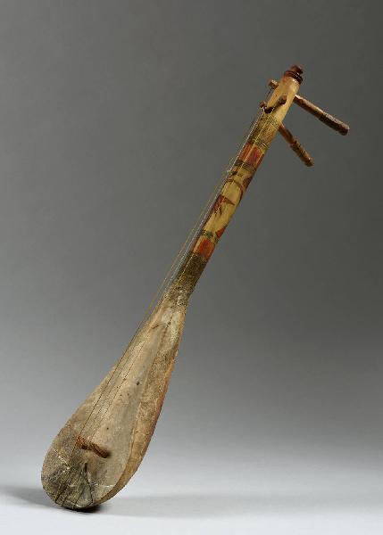 - NOTIZIE STORICO CRITICHE Esemplare del più diffuso liuto della musica popolare maghrebina e berbera, in generale costruito con una cassa di legno scavata in un solo pezzo, piriforme, ma ottenuto anche, come nel caso in questione, da un guscio metallico artificiale, o naturale,di tartaruga, di cocco o di zucca. Le corde di regola passano sotto un anello di corda (attualmente mancante) che le serra a mo' di capotasto e sono sollevate da un ponticello di legno mobile. È usato per l'accompagnamento ritmico del canto e della danza. La forma deriva in modo diretto da analoghi liuti dell'antico Egitto, a loro volta probabilmente introdotti in Africa con l'invasione degli Hyksos.