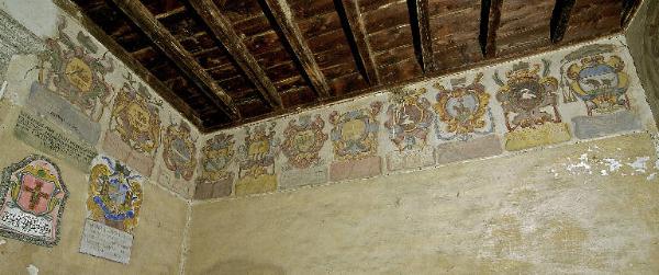 Gli stemmi di diverse forme e misure, corredati da lunghe iscrizioni, coprono la fascia alta del vano, su tutti e quattro i lati.