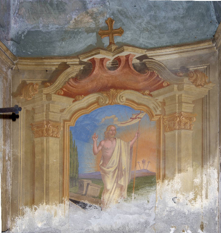 Gesù Cristo in piedi, con le mani alzate verso il cielo, regge il vessillo. Sulla sinistra si vede una quinta di cipressi. Sullo sfondo si stagliano tre croci. La scena è inquadrata da una finta cornice mistilinea decorata da doppie paraste laterali con elaborati capitelli ionici e da una esuberante cimasa spezzata alla sommità.