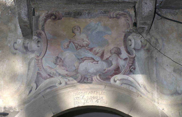 In una cornice mistilinea, ornata da volute, compare la Madonna seduta su nuvole sostenute da due angeli.