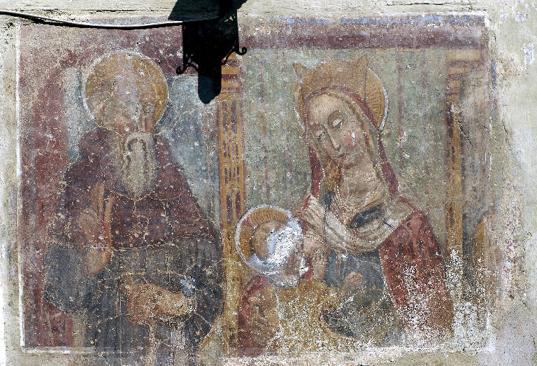 L'affresco, privo della parte inferiore, rappresenta Sant'Antonio Abate in atto benedicente, sulla sinistra, e la Madonna che allatta Gesù Bambino, sulla destra, affacciati da un'apertura scandita da esili pilastrini traforati.