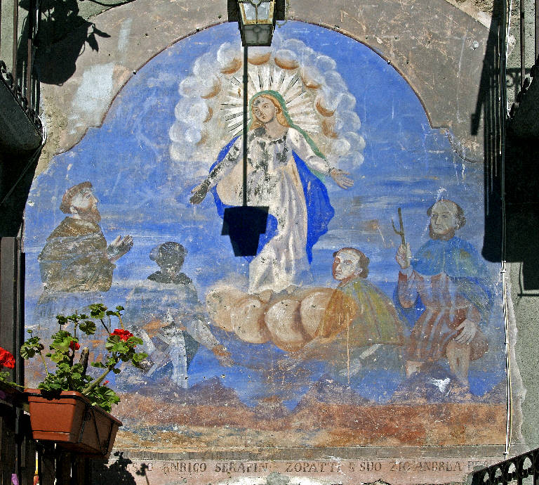 - NOTIZIE STORICO CRITICHE L'affresco, di fattura corsiva, è collocato sul fronte di un edificio posto all'inizio della contrada Zarri, in posizione dominante e ben visibile da chiunque acceda al nucleo, quasi a segnarne l'ingresso.