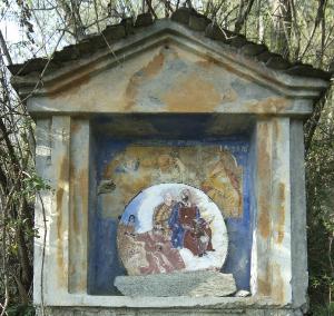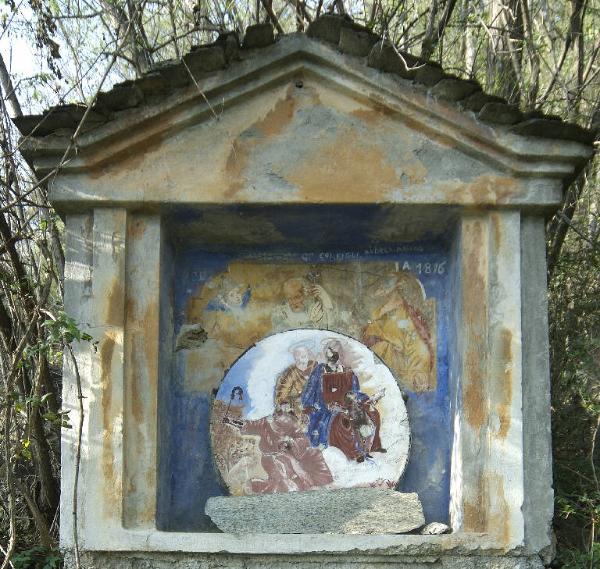 - NOTIZIE STORICO CRITICHE L'affresco originario, all'interno di una cappella votiva ubicata sul sentiero nel bosco che dalla località Gandelli portava alle soprastanti frazioni, è coevo alla costruzione della cappelletta (XVII secolo circa), ma è stato rimaneggiato pesantemente nel 1816, quando la Famiglia Albertazzi (come riporta l'iscrizione), lo fece ridipingere, alterandone l'aspetto originale. Tra l'altro nello stesso secolo parte del dipinto è stato coperto con un tondo in cemento, applicato alla parete, su cui è stato riportato un affresco di scarso pregio, raffigurante la Sacra Famiglia con Sant'Antonio Abate