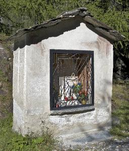 Nella nicchia interna si trovano affreschi lacunosi: sulla parete di fondo la Madonna con Gesù Bambino appare a un santo inginocchiato, che indossa un saio; sulla parete sinistra, invece, si vede un altro santo non identificabile.