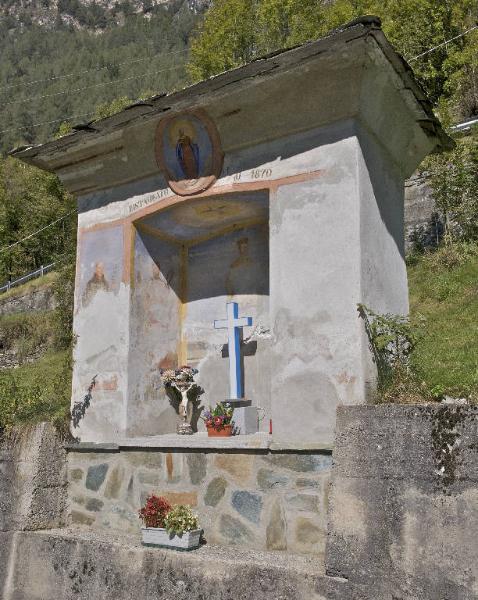 Edicola isolata con santi raffigurati sia sulle pareti della nicchia interna (parete di fondo e parete sinistra), che su un montante esterno della fronte. Alla sommità compare un medaglione con l'Immacolata. Sulla breve volta è rappresentata la colomba dello Spirito santo.