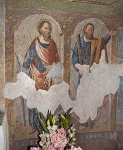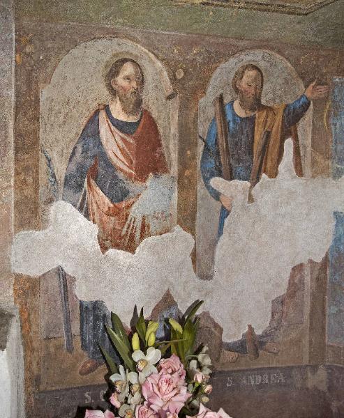 Sotto le arcate di un finto portico stanno San Cipriano, con la spada, di cui si vede solo la lama, e Sant'Andrea, con la croce.