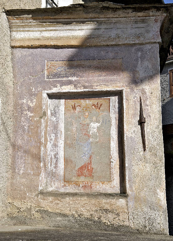 La Madonna compare in piedi, con Gesù Bambino in braccio.