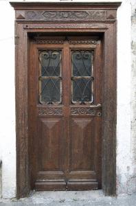 Porta in legno di larice con battenti decorati con motivi geometrici che presentano, inferiormente, formelle a punta di diamante sormontate da un ornato floreale e, superiormente, specchiature rettangolari occupate da vetri con inferriate. Spalle e architrave sono coronate da un elegante fregio interrotto dalle iniziali "B" ed "E" e da un aggettante cornicione.