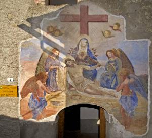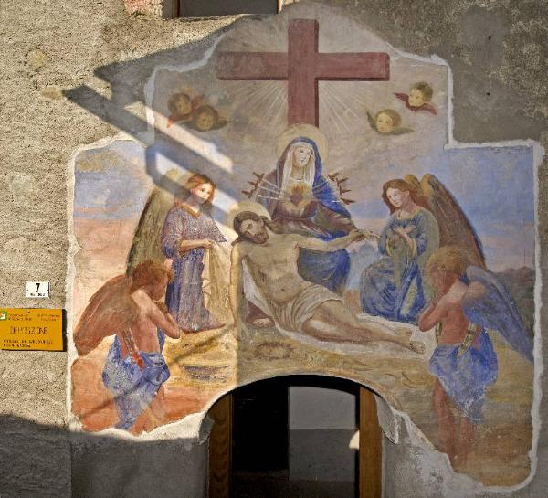 - NOTIZIE STORICO CRITICHE Il soggetto della "Mater Dolorosa" è caratterizzato dalla rappresentazione di sette spade che trafiggono il petto della Madonna, come nel dipinto murale in esame, in base a un'interpretazione letterale della profezia di Simeone: "Egli è qui per la rovina e la Risurrezione di molti, in Israele, segno di contraddizione perchè siano svelati i pensieri di molti cuori. E anche a te una spada trafiggerà l'anima" (Luca, 2, 34-35).