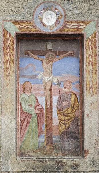 In una nicchia incorniciata esternamente da un serto di foglie lanceolate interrotto da un tondo, alla sommità, Cristo Crocifisso è contemplato dalle figure di San Giovanni, a sinistra, e di San Giuseppe, a destra.