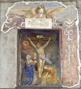 - NOTIZIE STORICO CRITICHE Il dipinto murale fu probabilmente eseguito in due tempi: prima la Crocifissione nella nicchia e, nel 1896, in occasione dei restauri, la figura dell'angelo che sorregge la tabella con l'iscrizione. Quanto all'iconografia, l'opera in esame presenta, a differenza di altre crocifissioni rinvenute nei dipinti murali esterni della valle, i simboli del sole e della luna che si ricollgano, secondo Sant'Agostino, al rapporto di prefigurazione che unisce i due Testamenti: l'Antico (la luna) si può comprendere soltanto alla luce del Nuovo (il sole).