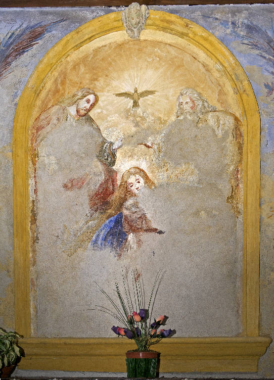 In una cornice centinata, ornata con una testa di cherubino, la Madonna, inginocchiata al centro, viene incoronata da Gesù Cristo, visibile a sinistra, e da Dio Padre, situato a destra. In alto sta la colomba dello Spirito santo.