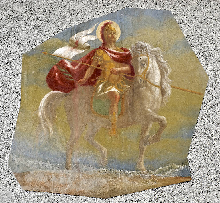 San Fedele, titolare della Parrocchia di Poggiridenti, è raffigurato come un militare a cavallo, con il vessillo crociato e la palma del martirio.