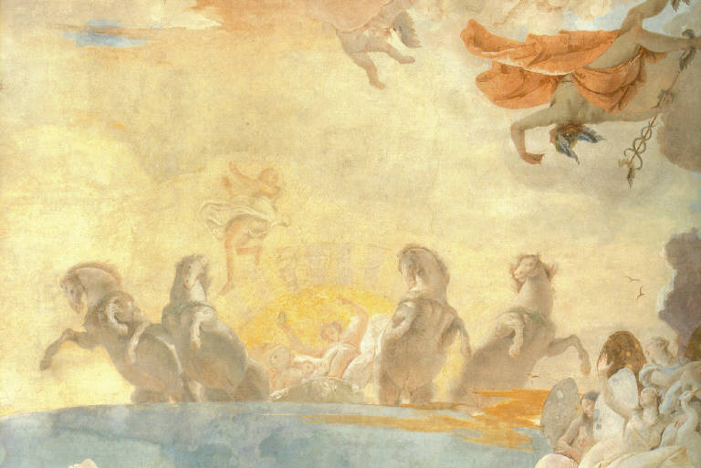 - NOTIZIE STORICO CRITICHE Il grande affresco con La corsa del carro del sole fu voluto dall'ultimo discendente della famiglia Clerici, Antonio Giorgio, che nel 1740 chiamò a decorare la volta della grande galleria del suo palazzo, sito nel sestiere di porta Comasina, Giovanni Battista Tiepolo, artista veneziano che a Milano aveva già soggiornato una decina di anni prima per realizzare alcuni affreschi in palazzo Archinto (andati distrutti durante la Seconda guerra mondiale) e in palazzo Dugnani, e anche nel 1737 quando dipinse, nella basilica di Sant'Ambrogio, la cappella di San Vittore e la volta della sacrestia dei monaci. Sono due le fonti che attestano la presenza del Tiepolo a Milano nel 1740 per adempiere alla commissione di Antonio Giorgio Clerici. Nel 1739 l'artista infatti rinviò un impegno con la Scuola Grande dei Carmini di Venezia "per mancanza di tempo riguardo le di lui occupazioni e per un trattato che gli si presenta di portarsi a Milano", inoltre al 1740 risale una raccolta di poesie del poeta Giovanni Battista Dal Pozzo, che celebra Tiepolo paragonandolo al Veronese, composta proprio in occasione dell'esecuzione dei lavori dell'artista in palazzo Clerici.\nFra i vari studi preparatori per l'affresco si distingue un bozzetto conservato al Kimbell Art Museum di Fort Worth (Texas), una piccola tela che raffigura al centro Apollo che ascende verso il cielo, il soggetto prefigura la realizzazione effettiva della volta, ma è realizzato con modalità differenti. Probabilmente quando Tiepolo realizzò tale bozzetto non aveva considerato le reali dimensioni della galleria, esso infatti è rettangolare e ha misure regolari, la galleria invece è sproporzionata con una lunghezza molto maggiore rispetto alla larghezza. Per tali ragioni l'artista dovette introdurre alcune modifiche affinché la rappresentazione suggerisse uno sfondamento spaziale. Tra i vari artifici messi in campo da Tiepolo abbiamo la moltiplicazione dei gruppi figurali, che nel bozzetto erano distribuiti solo agli angoli, mentre nell'affresco anche di lato per dilatare maggiormente lo spazio. Inoltre venne modificata la rappresentazione di Apollo, affinché non fosse più una sola figura isolata nello spazio ma rappresentato con tutto il carro del sole trainato da una quadriga, attraverso un forte scorcio dal sotto in su. Altri espedienti di carattere compositivo furono l'introduzione di membrature architettoniche (soprattutto concentrate sui lati corti) e il ruolo determinante giocato dalla luce interpretata attraverso i colori, stesi con pennellate molto limpide e libere e fatti scivolare uno nell'altro con passaggi tonali che testimoniano il grande virtuosismo del pittore.\nSull'interpretazione del tema prescelto per questo grande affresco, scartata l'ipotesi che potesse alludere al matrimonio del committente con Fulvia Visconti avvenuto nel 1733, è stata presa in considerazione l'idea che la corsa del carro del sole potesse invece fare riferimento all'Impero e in particolar modo a Maria Teresa d'Austria che proprio nel 1740 era salita al potere. Le ragioni più plausibili sembrerebbero però risiedere nell'intento di Antonio Giorgio di voler celebrare con questa grande opera il casato dei Clerici, ribadendo altresì, attraverso la figura di Apollo, il proprio sostegno alle arti.