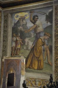 La parete laterale destra della cappella presenta la scena del martirio per decollazione di santa Caterina. La santa è raffigurata sulla destra, inginocchiata in preghiera mentre attende, imperturbabile, il fendente di spada che sta per essere sferrato dal suo aguzzino. Sul fondo dell'episodio principale sono inseriti tre astanti, uno dei quali indica, con un gensto della mano, il compiersi del fatto, mentre il resto del riquadro è occupato da un paesaggio montuoso. Quest'ultimo elemento è funzionale allo svolgimento della narrazione, dal momento che, sulla vetta del monte, è descritto il momento in cui due angeli avvolti da una intensa luce depositano il feretro della santa.