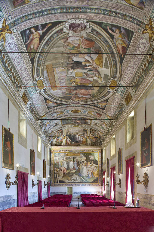 - NOTIZIE STORICO CRITICHE L'idea di decorare "magnificentissime" la sede del Collegio fondato da Carlo Borromeo si deve al cugino cardinale Federico, che in questo luogo aveva compiuto i suoi studi, fondando l'Accademia degli Accurati, e, come scrisse nel "De suis studiis commentarius", cominciando a interessarsi all'arte (una passione alla base della fondazione della Accademia Ambrosiana di Milano). La sede prescelta per ospitare gli affreschi non poteva che essere il grande vano del salone d'onore, terminato di costruire nel 1585 e ritrovo delle congregazioni degli alunni del Collegio. Il ciclo pittorico, destinato a celebrare la beatificazione di Carlo Borromeo (avvenuta il 16 settembre 1602), si inserisce appieno nel fervido clima artistico lombardo imperniato attorno alle parallele commissioni dei "quadroni" di Cerano per il Duomo di Milano. Non è dunque casuale che nel medesimo anno, il 1602, Federico Borromeo, dopo aver tentato invano di coinvolgere Guido Reni, convocò un pittore piuttosto noto all'epoca, Cesare Nebbia, per svolgere un compito analogo a quello in corso nel duomo milanese. Come si deduce dalla documentazione d'archivio ancora conservata, la decorazione del salone del Collegio Borromeo prese avvio dopo l'aprile del 1603, quando Nebbia giunse a Pavia insieme ad alcuni collaboratori, e si protrasse sino all'anno seguente, quando nel mese di marzo del 1604 furono conclusi gli affreschi della volta. Nebbia avrebbe poco dopo realizzato anche le scene della Peste e della Processione, collocate su una delle pareti brevi del salone. Il ritorno a Roma di Nebbia, avvenuto nell'autunno del 1604 (con la promessa di tornare a Pavia l'anno seguente), fornì al cardinale Federico l'occasione per intercettare da Venezia un altro pittore, Federico Zuccari. A lui si deve la realizzazione dell'episodio che campeggia sulla parete sud del salone del Collegio, raffigurante l'Imposizione del cappello cardinalizio a Carlo Borromeo. Dopo quest'ultimo intervento, concluso anch'esso nel 1604, i lavori si interruppero definitivamente: i lati lunghi del salone restarono infatti privi di decorazione pittorica. \nE' interessante osservare come sia Nebbia sia Zuccari fossero esponenti di rilievo della cultura più aggiornata del manierismo centro italiano. Tuttavia i due maestri si differenziavano notevolmente sul piano della resa stilistica ed espressiva: se il primo proveniva dal contesto romano, caratterizzato dalle commissioni eseguite da schiere di pittori al servizio dei pontefici (immensi cicli decorativi, non sempre di qualità elevata, realizzati per conto di Gregorio XIII, Sisto V e Clemente VIII), Zuccari rappresentava un pittore più colto e raffinato, che grazie ai viaggi a Roma, Firenze, Venezia, Torino, Mantova, Parma, in Spagna maturò un linguaggio decisamente più variegato. E' probabile che il cardinale apprezzasse queste qualità, da una parte la tendenza a narrare con vivacità (e con immagini di immediata comprensione) scene legate alla vita del cugino, dall'altra a elaborare una pittura intrisa di citazioni. Il valore esemplificativo delle pitture del Collegio, in grado di sottolineare il rilievo biografico degli episodi, più che la loro connotazione simbolica e dottrinale (sintetizzata nelle figure allegoriche e negli stemmi familiari presenti in altri punti della medesima volta) consente di ritenerle importanti per l'intonazione "popolare" e "pietistica" ereditata da alcuni maestri lombardi attivi nei primi decenni del Seicento.