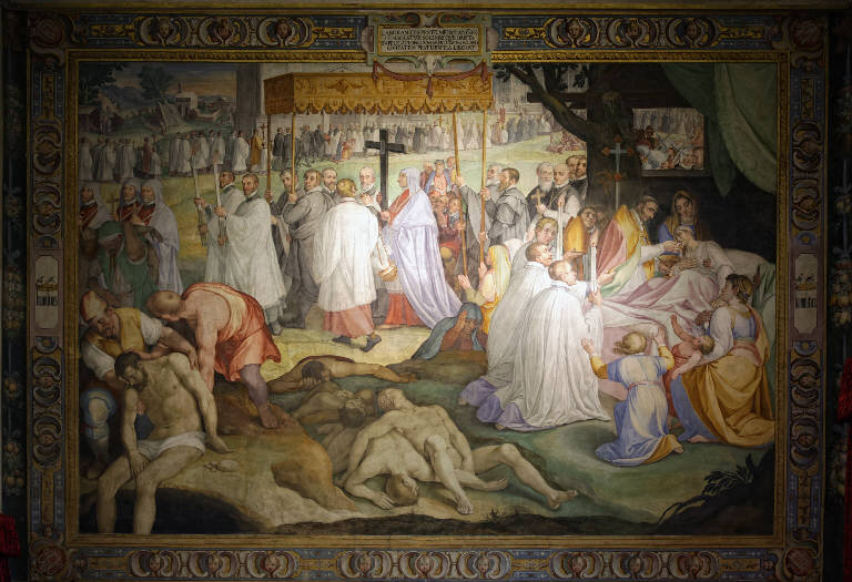 La scena rappresenta Carlo Borromeo impegnato in varie azioni benevole nei confronti dei bisognosi durante la peste che infuriò a Milano, come in gran parte del nord Italia, nel 1576. Il beato (quando l'affresco fu realizzato Carlo era stato da poco beatificato) è raffigurato mentre procede a piedi sostenendo la reliquia del Santo Chiodo, circondato da un lungo corteo di prelati e chierici che prosegue anche nello sfondo. Il beato torna a essere protagonista sulla destra, figurando nei consueti abiti da vescovo mentre impartisce la comunione a un appestato a letto. Sulla sinistra, in primo piano, l'attenzione è rivolta al dramma della peste: sono visibili vari cadaveri, riversi a terra l'uno sopra l'altro, mentre a fianco uno di essi sta per essere sotterrato in una fossa.