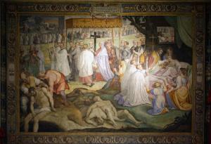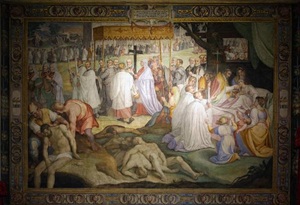 - NOTIZIE STORICO CRITICHE L'esecuzione dell'affresco è documentata dalla fitta corrispondenza che ancora si conserva e consente di precisare la scansione cronologica di tutta la partitura decorativa del salone del Collegio Borromeo. Dopo aver terminato gli affreschi della volta nel marzo del 1604, Cesare Nebbia, coinvolto nell'impresa del salone già dal 1602 e assistito da due anonimi collaboratori, "uno dei quali "si fa le spese da sé", si dedicò alla realizzazione della scena in esame, collocata sulla parete nord del salone. Stando alle carte, il 31 marzo 1604 il pittore orvietano annunciava di aver cominciato il cartone preparatorio e di voler concludere l'episodio nel giro di tre-quattro mesi, per fare ritorno a Roma con l'intento di riprendere il lavoro a Pavia entro l'anno seguente. Se la cronologia è confermata dal fatto che, in ottobre, il pittore avesse già terminato l'affresco, potendo concedersi "molte ricreationi ... e feste", non si verificò invece il suo ritorno a Pavia, previsto per la primavera del 1605. Per dare seguito all'impresa del salone il cardinale Borromeo decise di coinvolgere Federico Zuccari, convocandolo direttamente da Venezia. Anche quest'ultimo, tuttavia, non ultimò la decorazione: le pareti lunghe del salone restarono infatti incompiute. Nell'affresco in esame si può individuare lo stile espressivo del pittore orvietano, orientato verso una chiarezza narrativa che conferisce un senso icastico all'episodio, per non dire un valore esemplifcativo e didascalico. Da questo punto di vista è indubbio che Cesare Nebbia abbia assimilato la lezione impartitagli dal maestro, il bresciano Girolamo Muziano, che nella Roma gregoriana e poi sistina raggiunse una posizione di assoluto rilievo, diventando di fatto il pittore ufficiale del papa e in quanto tale coordinando i cantieri aperti per iniziativa pontifcia. La velocità d'esecuzione con cui Nebbia affrontò l'affresco, portato a termine in pochi mesi, riflette la formazione avvenuta nel contesto romano (dove ai pittori si chiedeva appunto massima rapidità, per coprire grandi pareti nel minor tempo possibile), ed è probabile che la scelta del Borromeo ricadde su di lui anche per questo motivo. Il legame tra i due, inoltre, è attestato da un poemetto intitolato "Dell'Eccellenza della pittura" che Nebbia dedicò al cardinale milanese nel 1594, dove è esposta la visione artistica del pittore, sostenitore della pittura di stampo "devozionale" che il Borromeo certamente prediligeva.