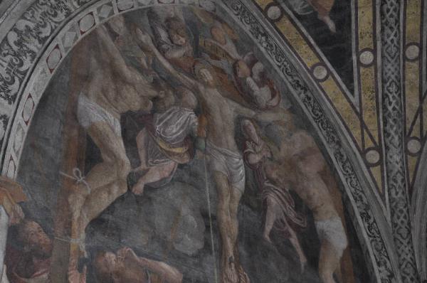 La parete sinistra della cappella raffigura la Crocifissione. La scena appare affollata di figure, che per la mancanza di spazio risultano compresse nel primo piano. Il registro inferioreè caratterizzato dalla presenza, consueta per questo tipo di raffigurazione, delle pie donne che sostengono la Vergine svenuta, al centro della Maddalena inginocchiata ai piedi della croce e a destra dei soldati che si dividono a sorte la veste del Signore. Nella zona mediana, oltre a un personaggio caratterizzato sul piano fisiognomico, prendono posto due soldati a cavallo (quello a destra dovrebbe essere Longino), mentre ai lati si scorgono alcuni soldati. Il registro superiore è dedicato, ovviamente, al Cristo in croce e ai due ladroni ai lati; anche in questo caso, tuttavia, l'ampia preenza di figure, in particolare di angeli, toglie ariosità alla composizione.