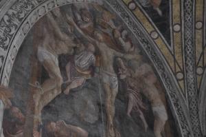 - NOTIZIE STORICO CRITICHE La cappella era gestita dai confratelli aderenti alla Confraternita di Santa Croce, che perseguiva scopi di assistenza ospedaliera. Nel testamento di uno dei consiglieri "seniori", Bernardino Ghilio (già committente di Bernardino Luini per l'oratorio di Santa Corona), redatto il 10 ottobre del 1539, si fornivano precise disposizioni affinché si facesse dipingere "unam anchonam pulcherrimam" e inoltre la si decorasse con affreschi relativi alla "vitam et passionem Domini nostri Jesu Christi"; tra le varie indicazioni del testatore vi era anche quella di affidare il lavoro "a bonis pictoribus". I due pittori individuati per portare a compimento questo prestigioso incarico furono Tiziano Vecellio e Gaudenzio Ferrari, verso i quali si scalano i pagamenti giunti tra il 1540 e il 1543, anni in cui fu realizzato l'intero apparato decorativo della cappella. La decorazione gaudenziana si inserisce nell'ultimo periodo dell'attività del maestro, coincidente con il decennio trascorso a Milano (a partire dal 1537), in una fase che segna l'apertura verso stilemi propri della "maniera" nord italiana, percepibili soprattutto nell'elevato numero di figure e in una articolazione compositiva che pregiudica l'effetto di schietto naturalismo cui ci aveva abituati il pittore in precedenza (per esempio nei capolavori lasciati in alcune cappelle del Sacro Monte di Varallo). Nell'ultimo quinquennio dell'attività milanese, culminato con la morte avvenuta nel 1546, Gaudenzio avvia una fiorente bottega che perpetrerà i modi del maestro, ormai diffusi e accettati nell'ambito dei prestigiosi circuiti di committenti cittadini (tra i principali protagonisti di questa stagione sono Giovanni Battista della Cerva e Giuseppe Giovenone il Vecchio). La critica, per questo settore della decorazione, ha in passato ipotizzato l'intervento di alcuni collaboratori; in realtà alcuni studi hanno dimostrato come nell'ultimo decennio dell'artista "non vi fu una fase di stanchezza e declino, bensì il coerente sviluppo dell'esperienza maturata negli anni precedenti".
