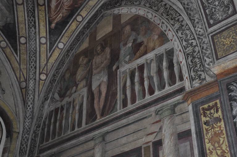- NOTIZIE STORICO CRITICHE La cappella era gestita dai confratelli aderenti alla Confraternita di Santa Croce, che perseguiva scopi di assistenza ospedaliera. Nel testamento di uno dei consiglieri "seniori", Bernardino Ghilio (già committente di Bernardino Luini per l'oratorio di Santa Corona), redatto il 10 ottobre del 1539, si fornivano precise disposizioni affinché si facesse dipingere "unam anchonam pulcherrimam" e inoltre la si decorasse con affreschi relativi alla "vitam et passionem Domini nostri Jesu Christi"; tra le varie indicazioni del testatore vi era anche quella di affidare il lavoro "a bonis pictoribus". I due pittori individuati per portare a compimento questo prestigioso incarico furono Tiziano Vecellio e Gaudenzio Ferrari, verso i quali si scalano i pagamenti giunti tra il 1540 e il 1543, anni in cui fu realizzato l'intero apparato decorativo della cappella. La decorazione gaudenziana si inserisce nell'ultimo periodo dell'attività del maestro, coincidente con il decennio trascorso a Milano (a partire dal 1537), in una fase che segna l'apertura verso stilemi propri della "maniera" nord italiana, percepibili soprattutto nell'elevato numero di figure e in una articolazione compositiva che pregiudica l'effetto di schietto naturalismo cui ci aveva abituati il pittore in precedenza (per esempio nei capolavori lasciati in alcune cappelle del Sacro Monte di Varallo). Alcuni studi hanno dimostrato come nell'ultimo periodo dell'artista "non vi fu una fase di stanchezza e declino, bensì il coerente sviluppo dell'esperienza maturata negli anni precedenti"; ciò risulta evidente nella sapiente regia spaziale orchestrata su questa parete della cappella, dove Gaudenzio fa ricorso a tutta la sua esperienza nel campo della resa di architetture prospettiche per simulare lo sfondamento dello spazio e il conseguente sviluppo in profondità delle scene.