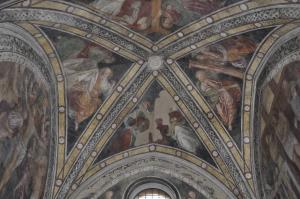 La volta è divisa in quattro vele grazie a un sistema di costolonature dipinte; il tema illustrato riguarda la Passione di Cristo, soggetto che trova articolazione anche negli affreschi presenti sulle pareti laterali, che raffigurano rispettivamente l'Ecce Homo e la Flagellazione, da una parte, e la Crocifissione dall'altra. Alla luce di questa precisazione si spiega la presenza, nelle quattro vele della volta, di otto angeli che reggono gli strumenti della Passione: pur in condizioni di conservazione che non agevolano l'interpretazione,si possono riconoscere la colonna della Flagellazione, la Croce, il sudario.