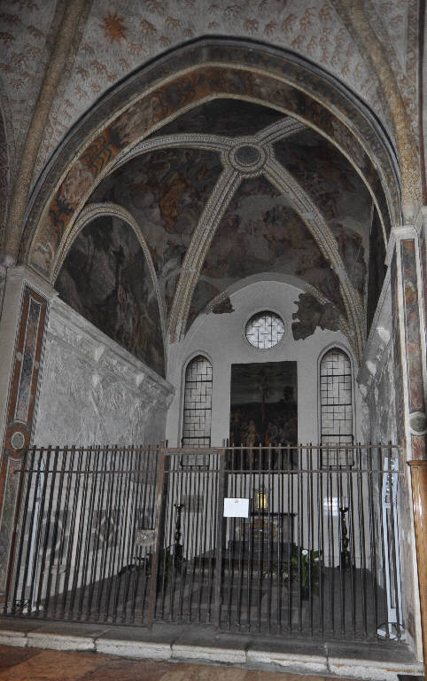 - NOTIZIE STORICO CRITICHE La decorazione della cappella fu commissionata da Domenico Sauli dopo dopo il 1541, anno in cui (secondo il Memoriale domenicano del 1757) il nobile genovese, presidente del Magistrato di Milano, decise di mutare la dedicazione di questo luogo da san Tommaso a san Domenico. Protagonista indiscusso dell'impresa cinquecentesca fu Giovanni Demio, un pittore che rappresenta un caso emblematico di maestro "girovago" nell'Italia del Cinquecento, il quale, dalla natia Schio, seppe aggiornare il suo linguaggio espressivo al punto da coniare una cifra stilistica personale e distintiva. Tra i viaggi formativi compiuti da Demio nell'arco di un trentennio risultò fondamentale la frequentazione del contesto veneziano già impregnato di maniersimo toscano (grazie alla presenza in laguna di Francesco Salviati e di Giorgio Vasari), oltre che dei risultati raggiunti da Giulio Romano a Mantova e la visione diretta delle novità centro italiane (importante fu la sua attività in qualità di mosaicista nel Camposanto di Pisa, documentata nel 1539; nella seconda metà degli anni quaranta Demio sarà anche a Napoli). L'ipotesi di un viaggio a Roma trova conferma nell'analisi delle diverse componenti stilistiche e culturali identificabili nelle pitture eseguite, tra il 1541 e il 1542, per il genovese Domenico Sauli, presidente del Magistrato delle entrate ordinarie a Milano, che aveva ottenuto in patronato la cappella di Santa Maria delle Grazie (in precedenza appartenuta ai Rusca). L'attribuzione a Giovanni Demio dell'affresco e, conseguentemente, delle altre pitture della cappella Sauli, compresa la pala raffigurante la Crocefissione, è confermata dalla presenza, nell'angolo in basso a destra dell'Andata a Emmuas, della firma "Johannes Demius de Scledo P.", oggi purtroppo scomparsa. In entrambe le lunette delle pareti prevale la componente paesaggistica, sull'esempio di quanto andavano facendo altri pittori veneti come Battista Franco, che grandi meriti ebbe nel mettere in rapporto Venezia e Roma intorno alla metà del Cinquecento. Alla poetica sviluppata negli stessi anni a Padova, non solo da parte del Franco ma anche dall'olandese Lambert Sustris, rimandano le rovine archeologiche visibili nel paesaggio sullo sfondo. Del tutto caratteristiche del Demio, invece, sono le figure allungate, i cui panneggi tortuosi risultano scanditi da linee parmigianinesce e definiti da un disegno anatomico debitore, nell'esuberanza muscolare, delle figure michelangiolesche. La volta si presenta in precarie condizioni di lettura a causa del danneggiamento provocato dai bombardamenti alleati del 1943. \nLa cappella è impreziosita da un apparatro di stucchi, eseguito in fasi diverse. Quelli della volta (così come il pregevole pavimento) sono in linea con la datazione proposta per gli affreschi, quindi sono pienamente cinquecenteschi, mentre le due partiture laterali raffiguranti angeli tra festoni, in passato considerate coeve al resto (addirittura attribuiti allo stesso Demio), parrebbero essere invece degli interventi ottocenteschi.