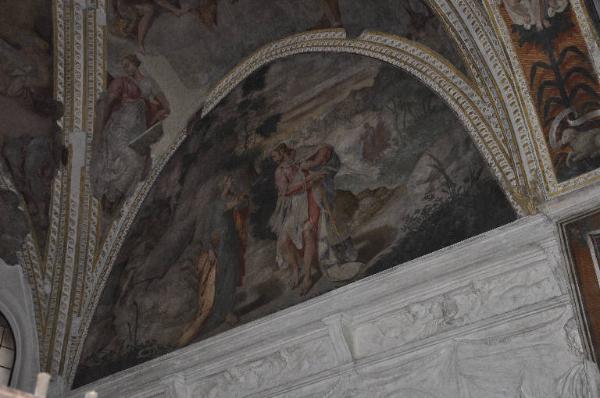 - NOTIZIE STORICO CRITICHE Protagonista indiscusso dell'impresa cinquecentesca fu Giovanni Demio, un pittore che rappresenta un caso emblematico di maestro "girovago" nell'Italia del Cinquecento, il quale, dalla natia Schio, seppe aggiornare il suo linguaggio espressivo al punto da coniare una cifra stilistica personale e distintiva. Tra i viaggi formativi compiuti da Demio nell'arco di un trentennio risultò fondamentale la frequentazione del contesto veneziano già impregnato di maniersimo toscano (grazie alla presenza in laguna di Francesco Salviati e di Giorgio Vasari), oltre che dei risultati raggiunti da Giulio Romano a Mantova e la visione diretta delle novità centro italiane (importante fu la sua attività in qualità di mosaicista nel Camposanto di Pisa, documentata nel 1539; nella seconda metà degli anni quaranta Demio sarà anche a Napoli). L'ipotesi di un viaggio a Roma trova conferma nell'analisi delle diverse componenti stilistiche e culturali identificabili nelle pitture eseguite, tra il 1541 e il 1542, per il genovese Domenico Sauli, presidente del Magistrato delle entrate ordinarie a Milano, che aveva ottenuto in patronato la cappella di Santa Maria delle Grazie (in precedenza appartenuta ai Rusca). L'attribuzione a Giovanni Demio dell'affresco e, conseguentemente, delle altre pitture della cappella Sauli, compresa la pala raffigurante la Crocefissione, è confermata dalla presenza, nell'angolo in basso a destra dell'Andata a Emmuas, della firma "Johannes Demius de Scledo P.", oggi purtroppo scomparsa. In entrambe le lunette delle pareti prevale la componente paesaggistica, sull'esempio di quanto andavano facendo altri pittori veneti come Battista Franco, che grandi meriti ebbe nel mettere in rapporto Venezia e Roma intorno alla metà del Cinquecento. Alla poetica sviluppata negli stessi anni a Padova, non solo da parte del Franco ma anche dall'olandese Lambert Sustris, rimandano le rovine archeologiche visibili nel paesaggio sullo sfondo. Del tutto caratteristiche del Demio, invece, sono le figure allungate, i cui panneggi tortuosi risultano scanditi da linee parmigianinesce e definiti da un disegno anatomico debitore, nell'esuberanza muscolare, delle figure michelangiolesche.