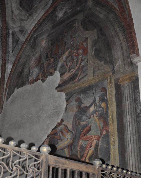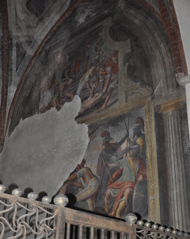 - NOTIZIE STORICO CRITICHE Gli affreschi sono riconducibili, senza alcun dubbio, alla bottega dei due fratelli Giovan Mauro e Giovanni Battista Della Rovere, conosciuti anche come i Fiammenghini. Questi pittori, attivi in tutto il contesto lombardo della prima metà del XVII secolo nell'ambito degli ordini religiosi e ben inseriti nel clima culturale borromaico, si caratterizzano per una pittura dai toni illustrativi e narrativi, di facile lettura e comprensione, priva di ogni connotato intellettualistico. Le composizioni, ma soprattutto i temi iconografici sviluppati e proposti dai Fiammenghini nell'arco della loro attività (conclusa con la peste del 1630), risultano estremamente didattici per rispondere alle istanze di immediatezza promosse proprio da san Carlo. In questo senso non è un caso che, sul piano stilistico, il loro stile debba molto alla presenza, in terra lombarda, di pittori come Cesare Nebbia e Federico Zuccari, attivi nel Collegio Borromeo di Pavia all'aprirsi del XVII secolo. Partendo da questi modelli, ma in generale dai modi della cultura pittorica dell'Italia centrale, Giovan Mauro e Giovanni Battista collaudarono schemi compositivi riproposti sino alla noia, che accentuarono gli elementi pietistici e devozionali sull'esempio anche dei Sacri Monti, dove peraltro lavorarono anch'essi), marcando i dettagli di crudo natiuralismo, come emerge negli affreschi della cappella di Santa Maria delle Grazie, in particolare per quanto riguarda la descrizione delle scene di martirio. I due pittori, infatti, avevano compreso come il realismo potesse attrarre e impressionare maggiormente lo spettatore-fedele, aumentando la forza espressiva delle immagini. Ecco spiegata la tendenza a una stesura pittorica quasi dimessa nei toni (pur tenendo conto di un generale stato di conservazione tutt'altro che ottimale) e a una accentuazione dei gesti che concentra l'attenzione sulla scena più che sulla sua rappresentazione. Difficile risulta operare una netta distinzione di mani all'interno della bottega dei due fratelli, soliti a collaborare in molte imprese e pertanto caratterizzati da un modus operandi piuttosto simile. E' stato tuttavia osservato che, mentre negli affreschi delle pareti sembra di poter essere individuata la responsabilità maggiore di Giovan Battista della Rovere, la volta potrebbe spettare all'altro fratello, incline a eseguire figure di accentuata monumentalità.